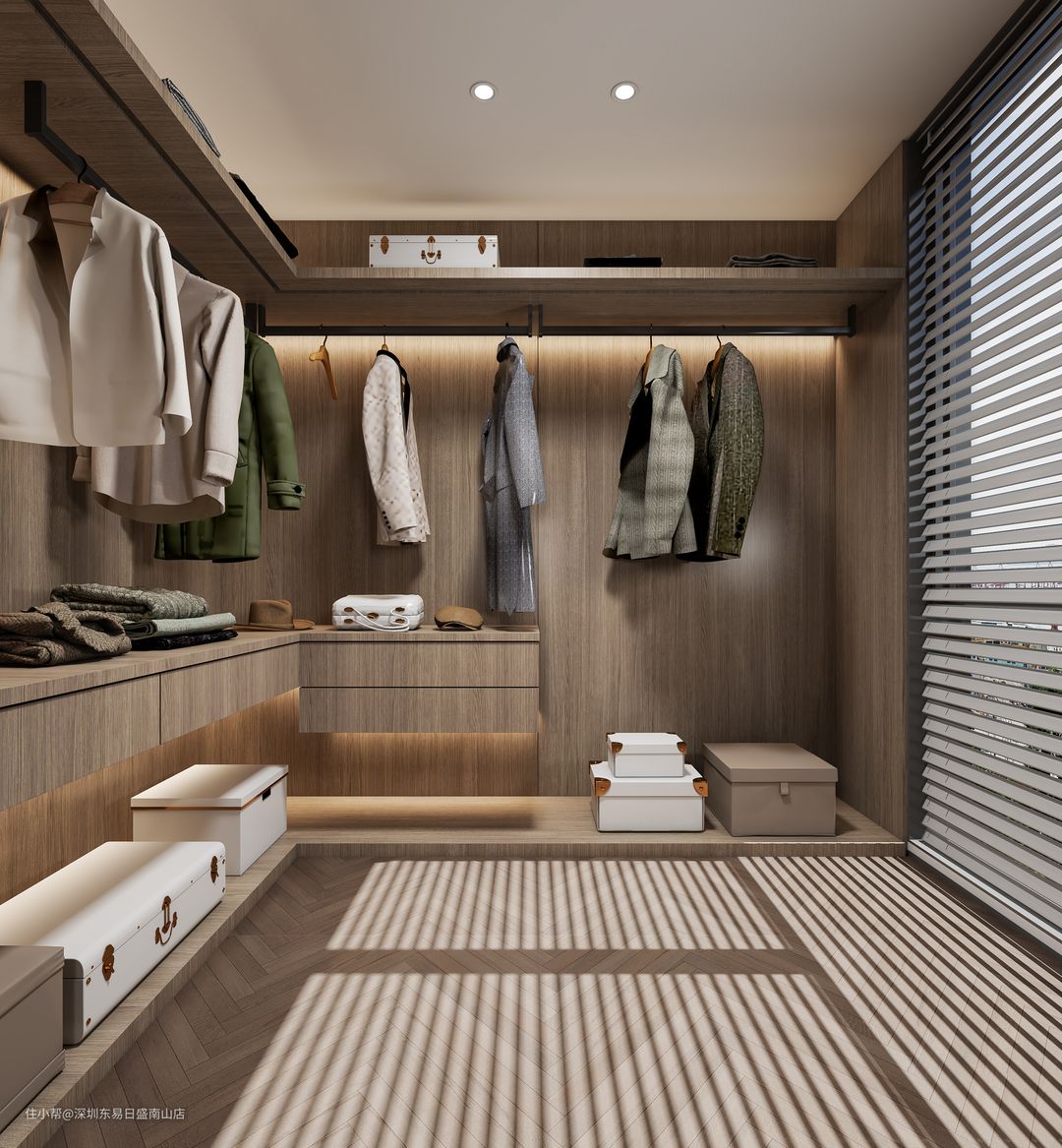 以胡桃木为主的开放式衣帽间,点缀以暖光灯带,层次更分明,使用更方便,同时还让空间更显通透宽敞