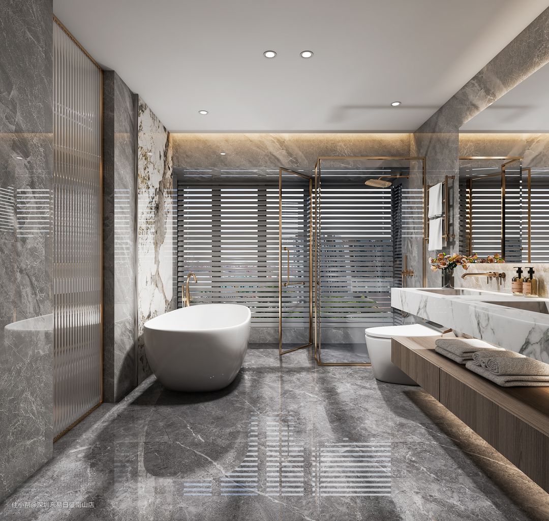 整体深色大理石瓷砖的设计更显奢华,极简设计将空间放大,带来放松的舒适体验