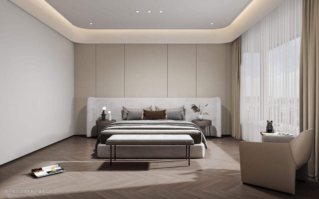 以浅木色为主的主卧,床头背景墙以木饰面为点缀,浅灰色软床靠垫,大气十足