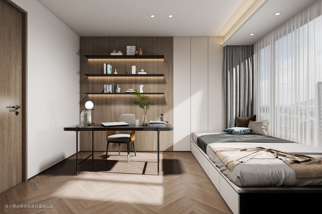 次卧沿窗做榻榻米,白色柜体加胡桃木