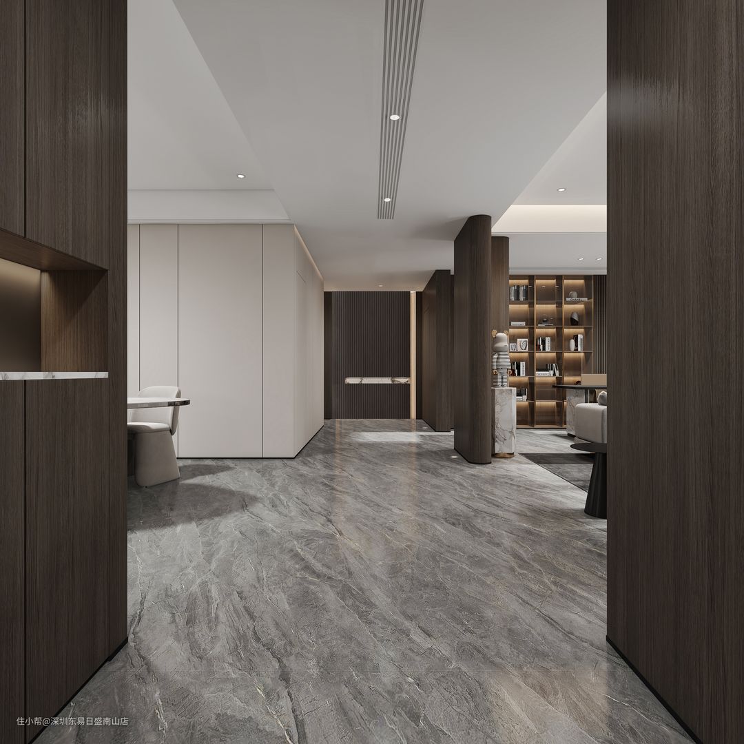 深色大理石瓷砖通铺,空间视觉延伸。