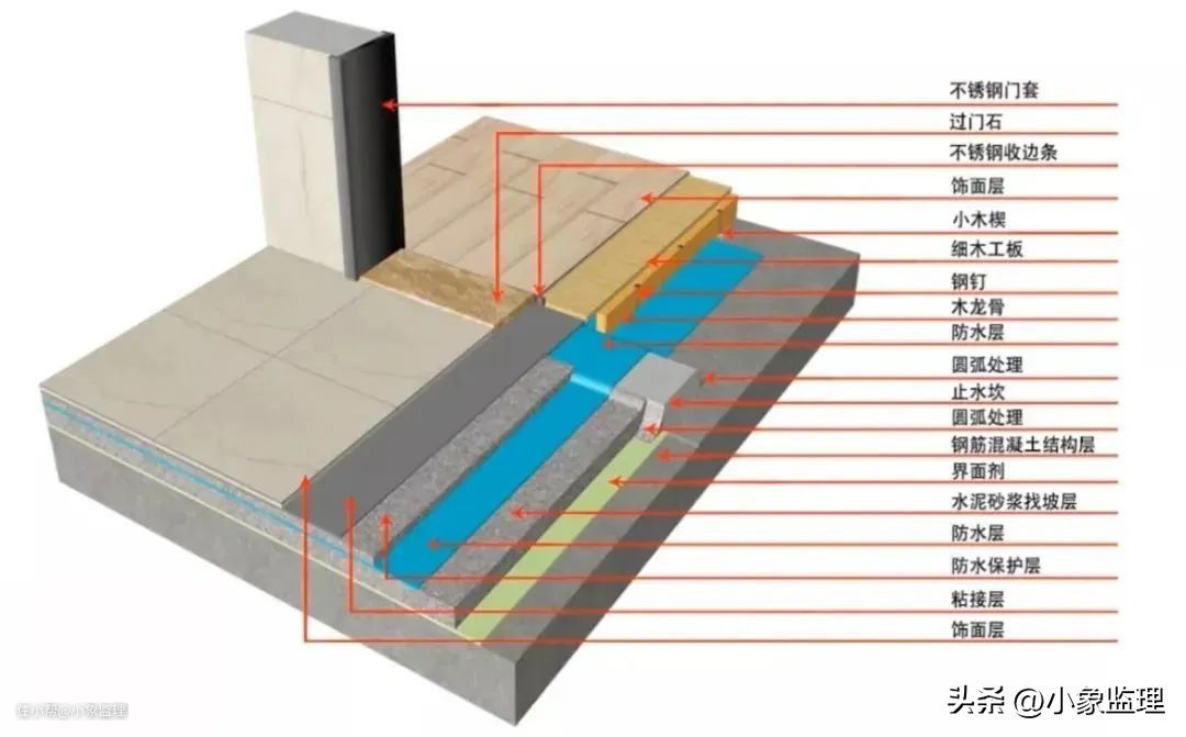 测量复核→止水坎→刷界面剂→倒角处理→水泥砂浆找坡层→防水层→水泥砂浆防水保护层→粘结层→饰面层→收口