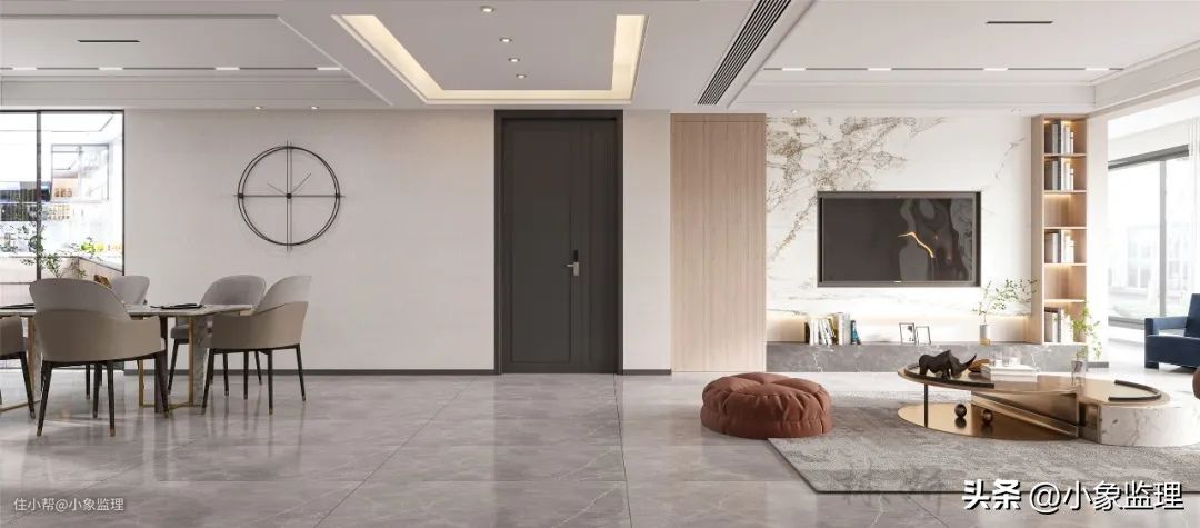 这是想要去除门槛石最好的办法,非常整洁且容易打理。找平之后,门口区域对缝铺贴即可,但这样花费的时间和材料耗损会高出许多,最后效果取决于施工师傅的工艺水平。