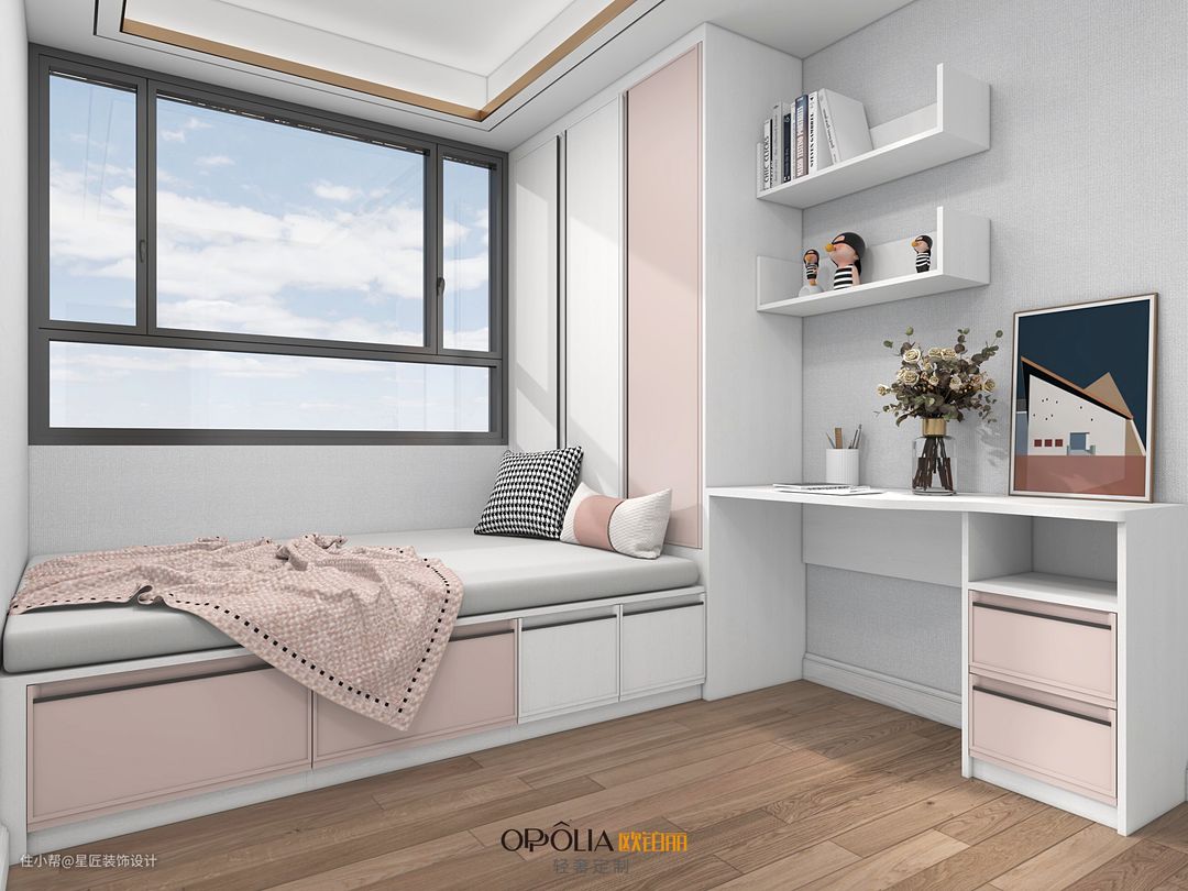 飘窗位可不仅仅可以设计成飘窗柜,也可以设计为柜体与床头柜相连,变成书柜使用,以便于收纳书籍。还可以设计成化妆桌,比如化妆桌+飘窗柜的设计,可以同时满足女生的需求也符合用户收纳需求