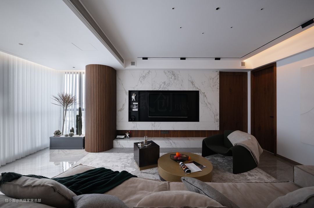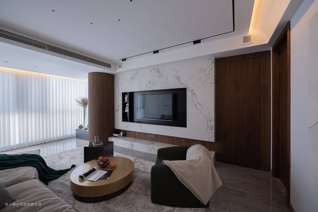 这套案例就在客厅电视墙上安装了一扇隐形门,不知道大家有没有发现呢?首先是在电视墙上使用了许多木材与大理石拼接,然后将隐形门融入一侧的模板中,因门与木材款式颜色都一模一样,所以不注意还会以为只是装饰物罢了。