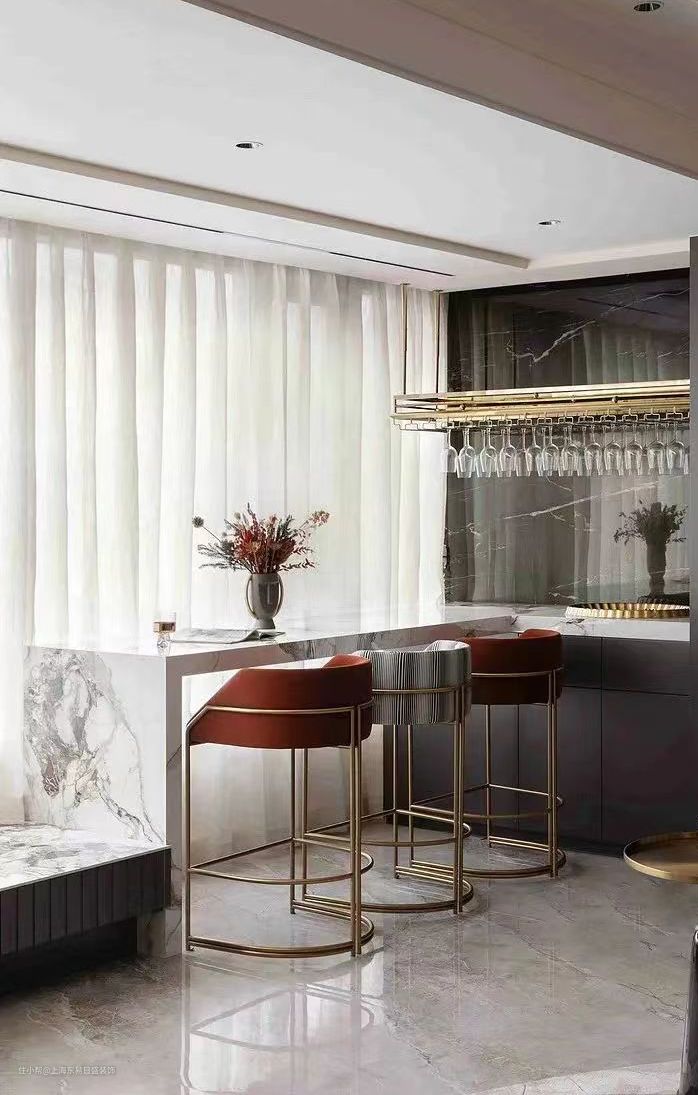 如果家里格局比较小,常住人口在3人以内,不妨考虑做个小型的隔断式吧台。吧台设置在厨房与餐厅之间,可以充当隐形的隔断,既维护空间通透性和明亮度,又能多一块功能区,实现不同场景的切换。