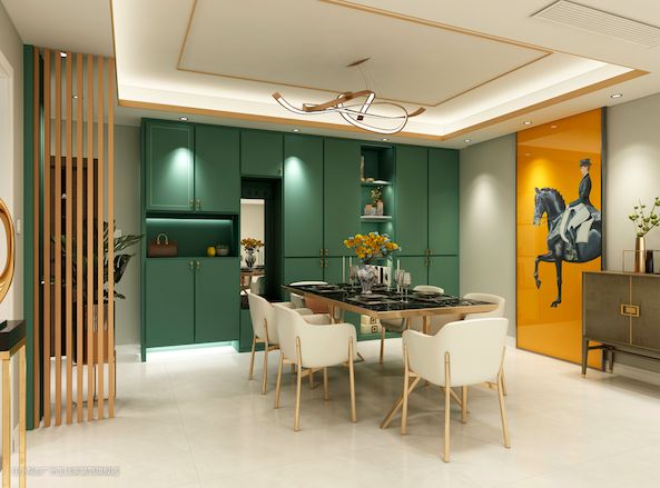 本方案为现代轻奢风格,客厅的酒柜鞋柜采用一体化设计,以绿色为主色调,储藏间的门采用定制推拉门设计,以橙色为主色,即实用,又有装饰的功能。
