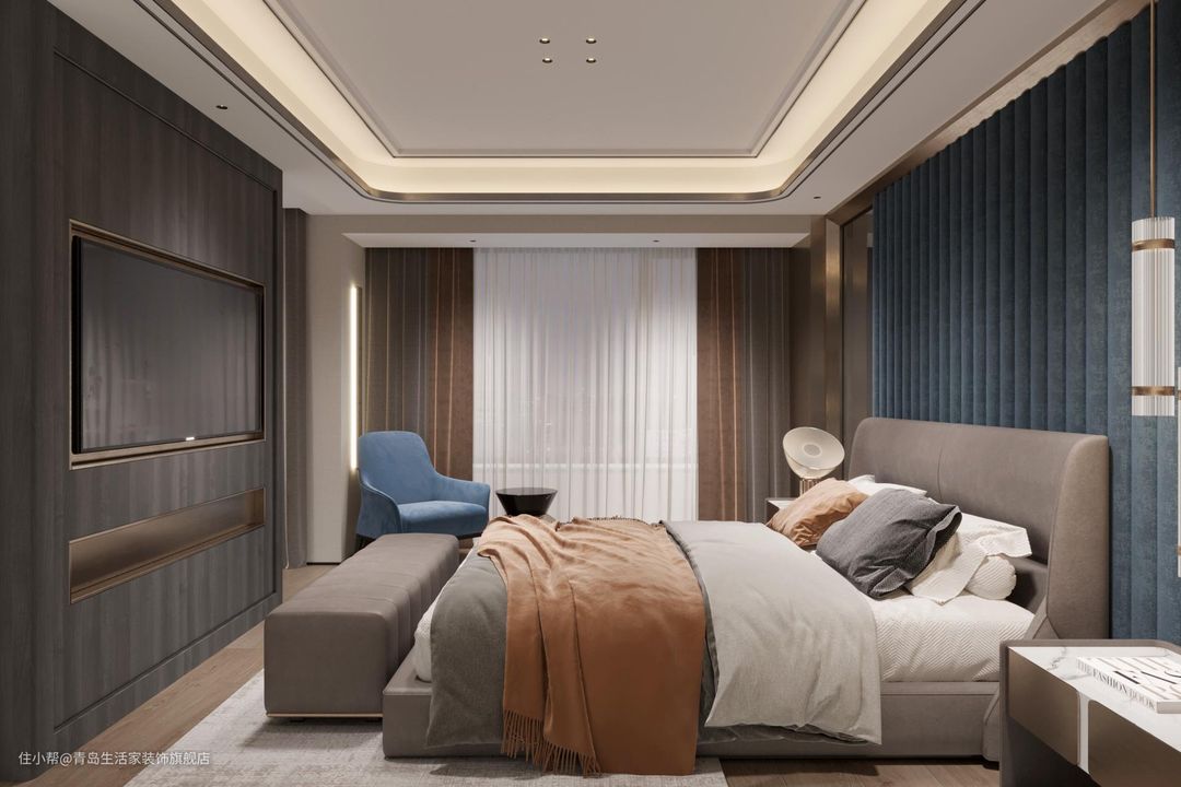 主卧是温柔的蓝色、稳重的胡桃木色、爱马仕橙色,正好也是业主开朗的性格。顶面悬浮吊顶有氛围灯光的柔和也有无主灯的功能照明。