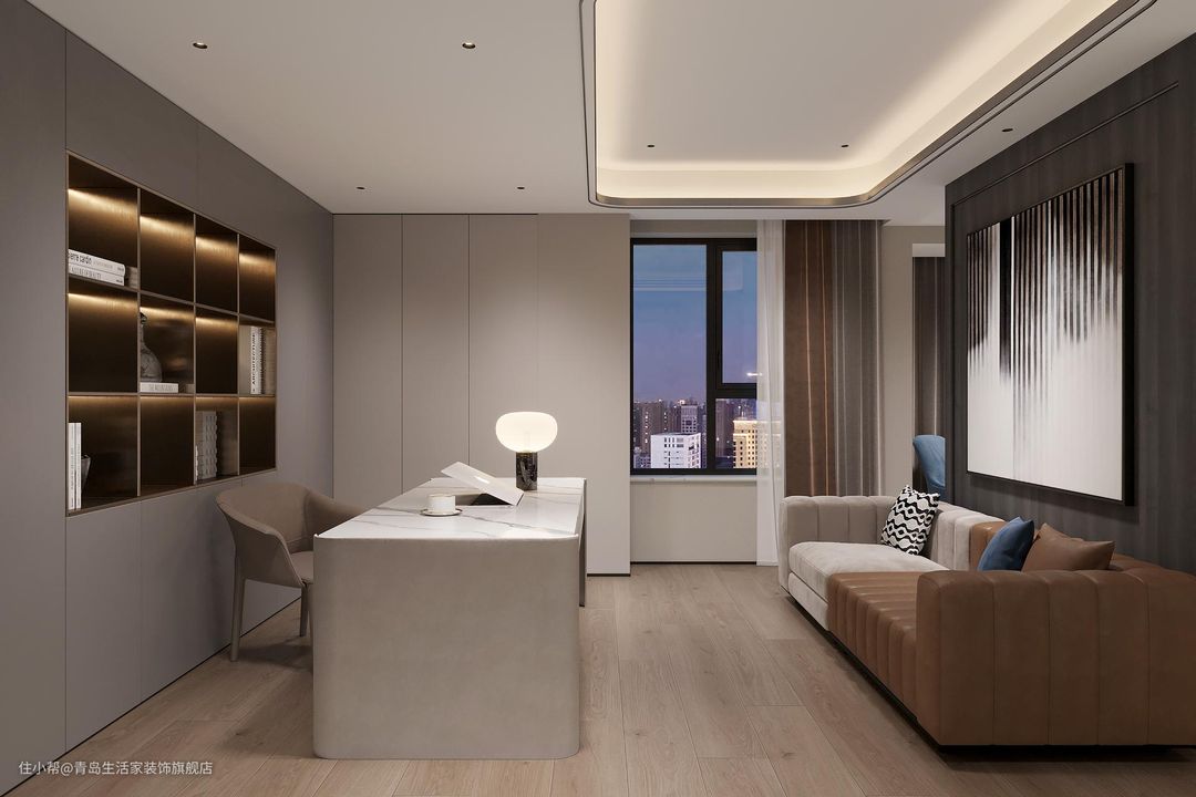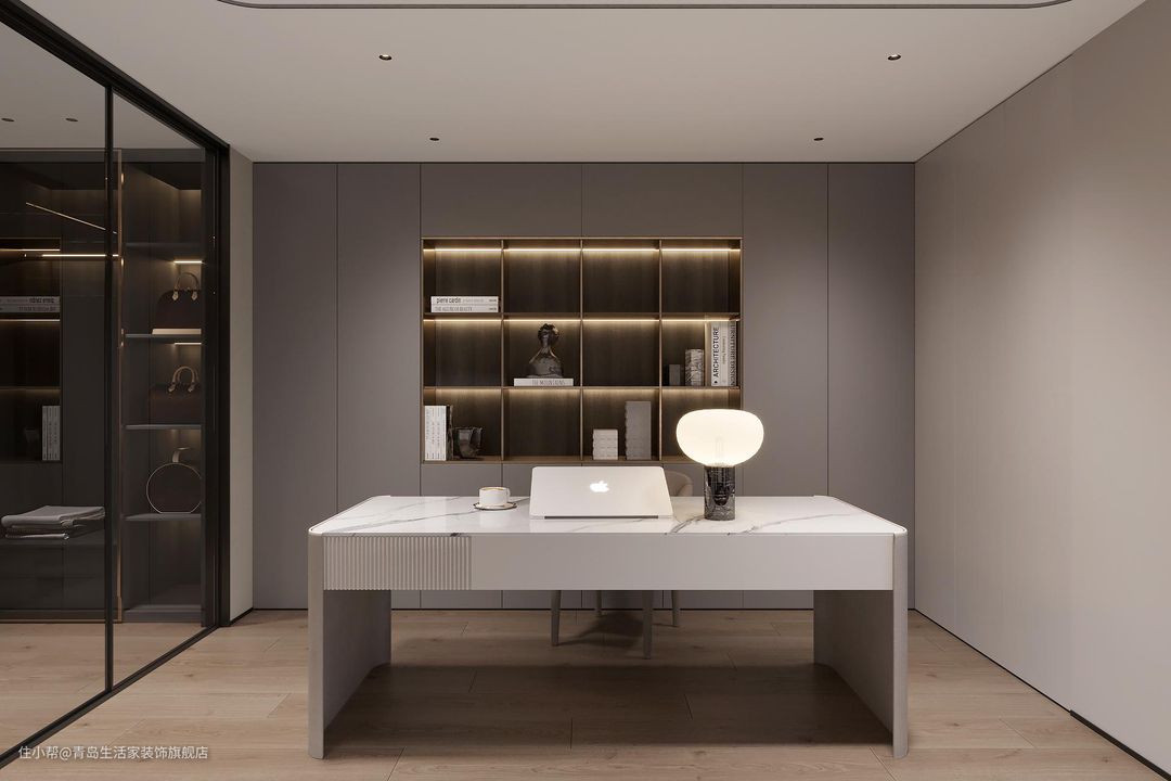 书房选用了宁静的灰色,长条办公桌,舒适座椅。