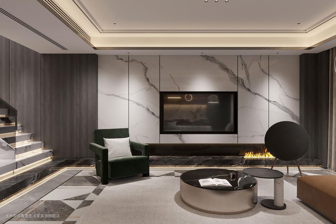 经典的米色、茶色、温暖中还有低调的高级,搭配墨绿色和橙色给空间色彩多一些色彩碰撞的活力,爵士白岩板电视墙,内嵌电视,石材地台和装饰现代壁炉,摩登拼花地面增加时尚感。