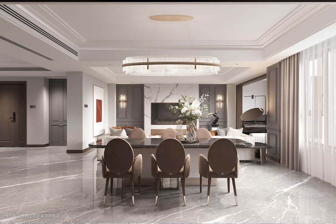 餐厅区域壁炉和装饰画加上顶面顶奢主灯。黑色大理石长条桌,搭配莫兰迪脏粉餐椅,色彩温柔很适合其乐融融的家人共进晚餐。