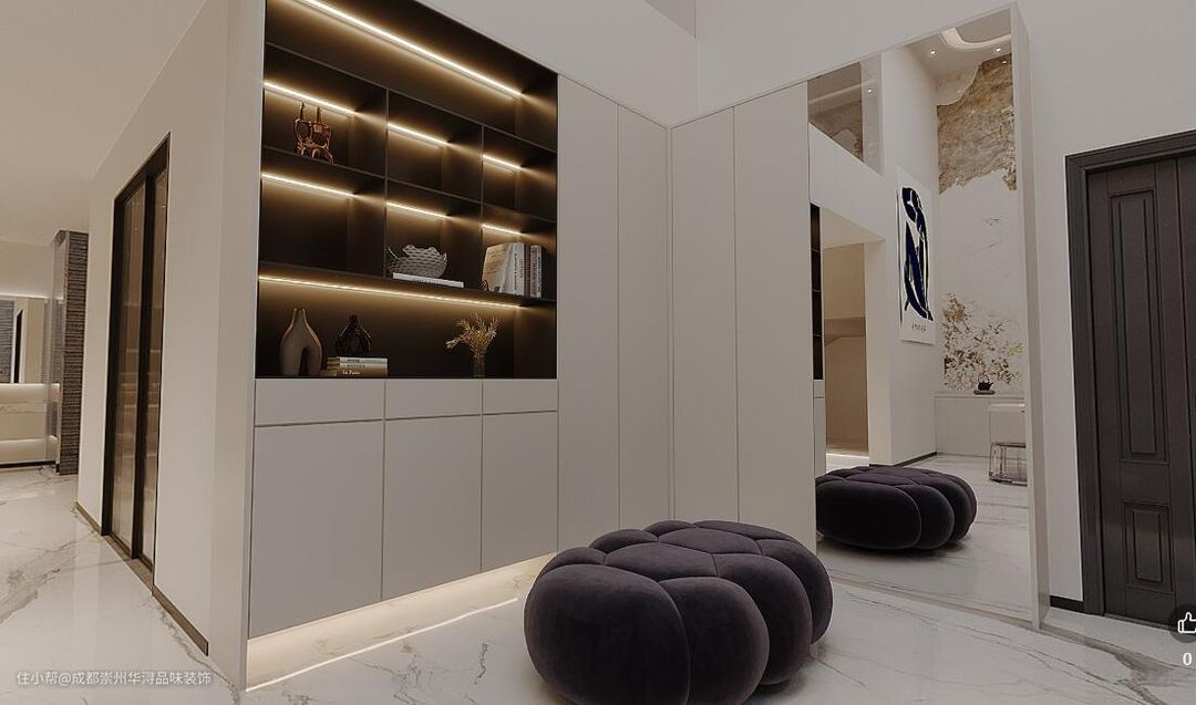 茶台后面设计了一排装饰柜,内藏灯光,十分有格调。