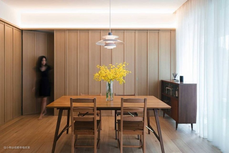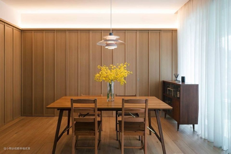 餐厅充满了原木元素,利用原木元素让居住空间更显惬意柔和,在吊顶下方增加灯带设计,营造餐厅空间的氛围感和温暖气质,在距离餐桌一米的位置选择吊灯,照亮一家人的用餐时光,色温在3000k左右,不会刺眼,反而能让用餐的人放松下来,增加食欲。 餐厅的设计是以氛围感为主,一家人的用餐时光是温馨惬意的,暖光色的灯光起着重要的烘托作用。在餐桌上放上当季的鲜花,提高生活仪式感,让居家的每一天都有好心情。
