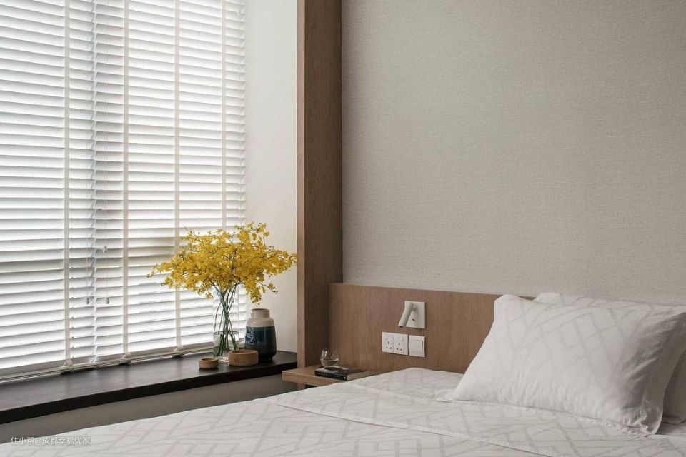 在床头增加可调节的小壁灯设计,避免光线的单调,增添温馨感。在飘窗处增加黑色石材铺贴,在色彩上更有层次感的同时,也可以作为休闲区。 选择百叶窗进行光线调节,光影效果更好。在室内空间养几株绿植和鲜花,装点空间,让整个卧室更有仪式感。
