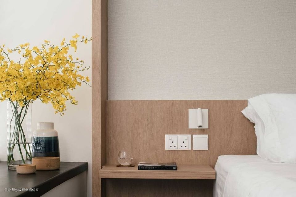 卧室仍然延续原木元素的设计,床头背景墙选择原木元素做半墙设计,赋予卧室空间设计感。 在卧室背景墙选择米色墙布装饰,为了卧室空间不单调,在床头增加原木元素做半墙设计,起到保护墙体的作用,塑造层次感。