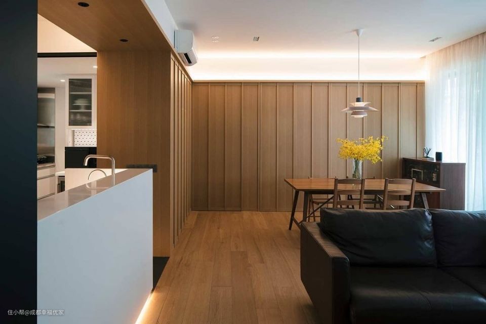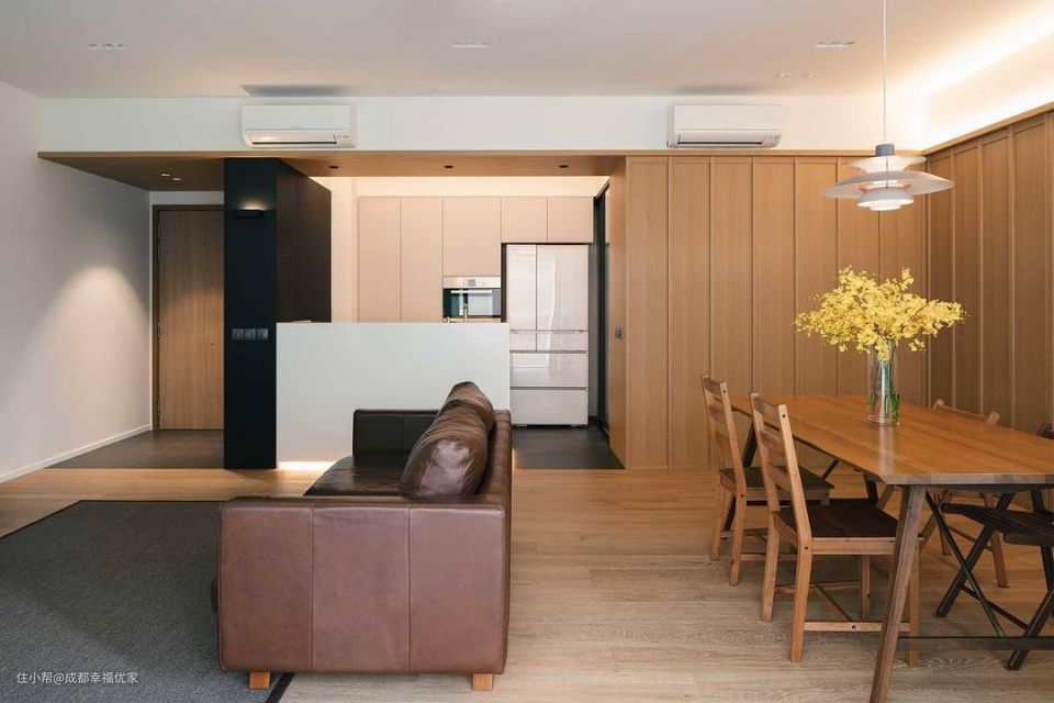 温柔原木风,客餐厨一体式设计,搭配折叠门完美隐藏书房