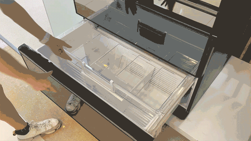 ▲下层冷冻室、蔬果室均为按压式电动抽屉,只需轻点按钮,就像安装了滚轮的抽屉一般柔缓弹开,遇阻即停。同样双手冷冻食材拉满,用脚开门会比较便利,日常也可以作为哄娃神器~我家娃6-12个月的时候最爱玩的就是冰箱电动门,不过我的冰箱没有电动抽屉只有电动门,只能抱着他玩,时间长了累断手。。