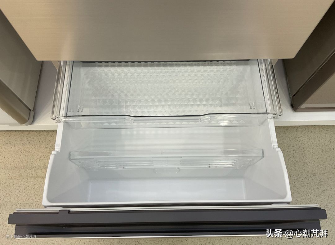 ▲日式六门,冷冻区三个门共155L容积,有制冰室和两个冷冻区。下部冷冻区与750KC一样为三层式抽屉结构,顶层有铝盘,有急冷冻功能。