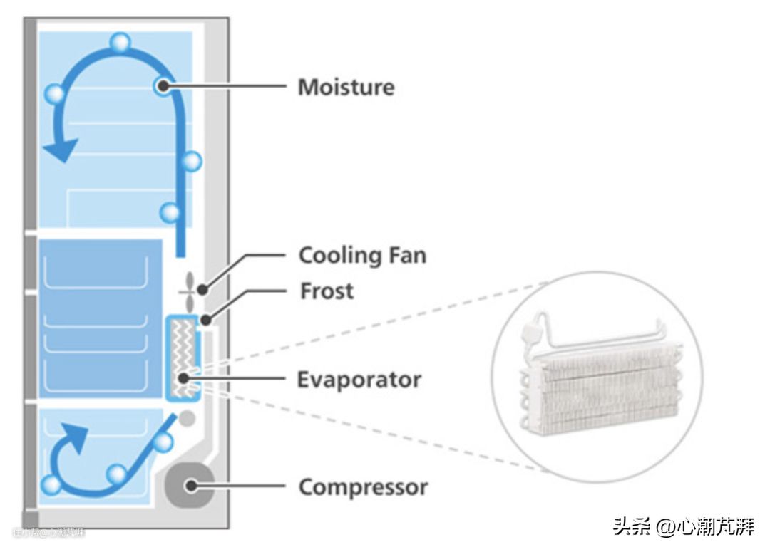 ▲霜能循环,有效利用附在冷却器上的霜能,实现冷藏室、果蔬室的制冷,降低压缩机工作量,从而更加节能。
