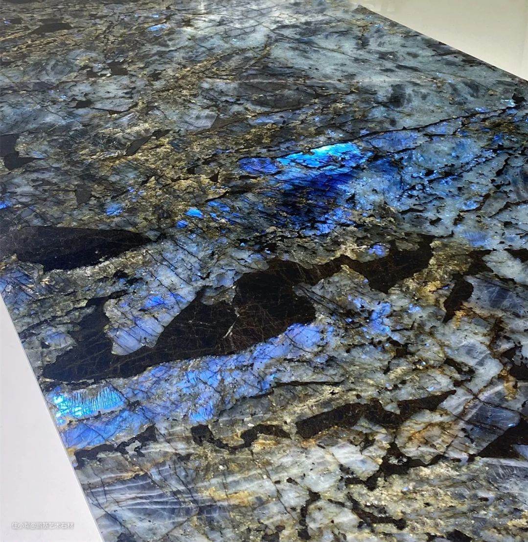 极具观赏性的台面使它在家具中深受追捧,蓝翡翠在灯光的折射下散发出别样的神秘魅力,宛若星辰熠熠生辉。