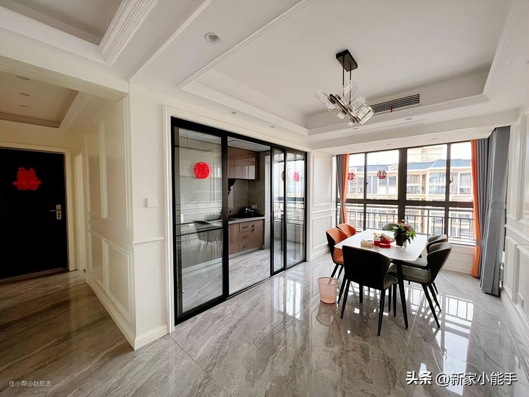 四房两厅南北通透的户型,考虑到作为婚房,其中把一个房间作为衣帽间了。现在的视角所看到的是餐厅区域,餐厅选择布置了一张方形岩板餐桌,占用的空间大小位置合适。其实,如果喜欢圆形餐桌,空间都是足够的。这种款式的餐桌,非常流行,也很让人喜欢,觉得很时尚。旁边移动门进去就是厨房了,煮好的饭菜可以很快端出来,方便用餐。南北通透的户型,就是让人喜欢,室内采光与光线非常充足!