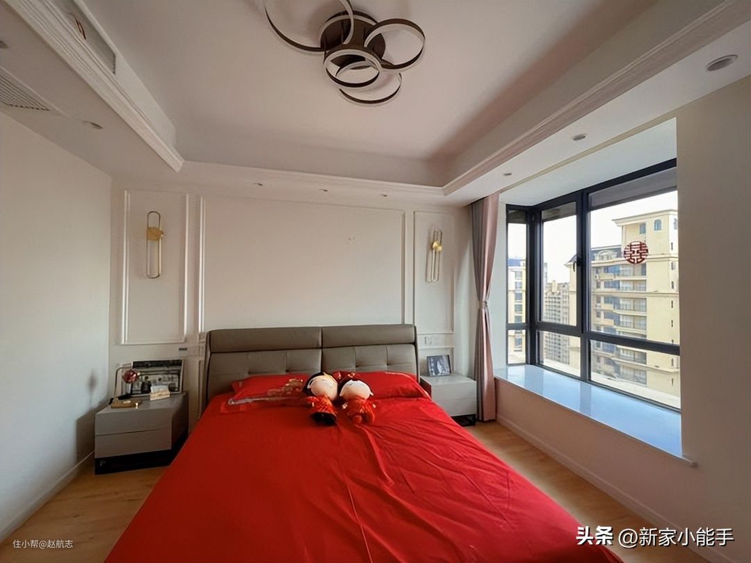 这是主卧,床头背景墙贴了 石膏线条,两边还安装了壁灯,晚上可以起到增加二次照明的作用。一张双人大床,其实也没有什么多余的空间了。飘窗很大,可以当小沙发使用,采光很充足。作为婚房,床上四件套为大红色,太喜庆啦。