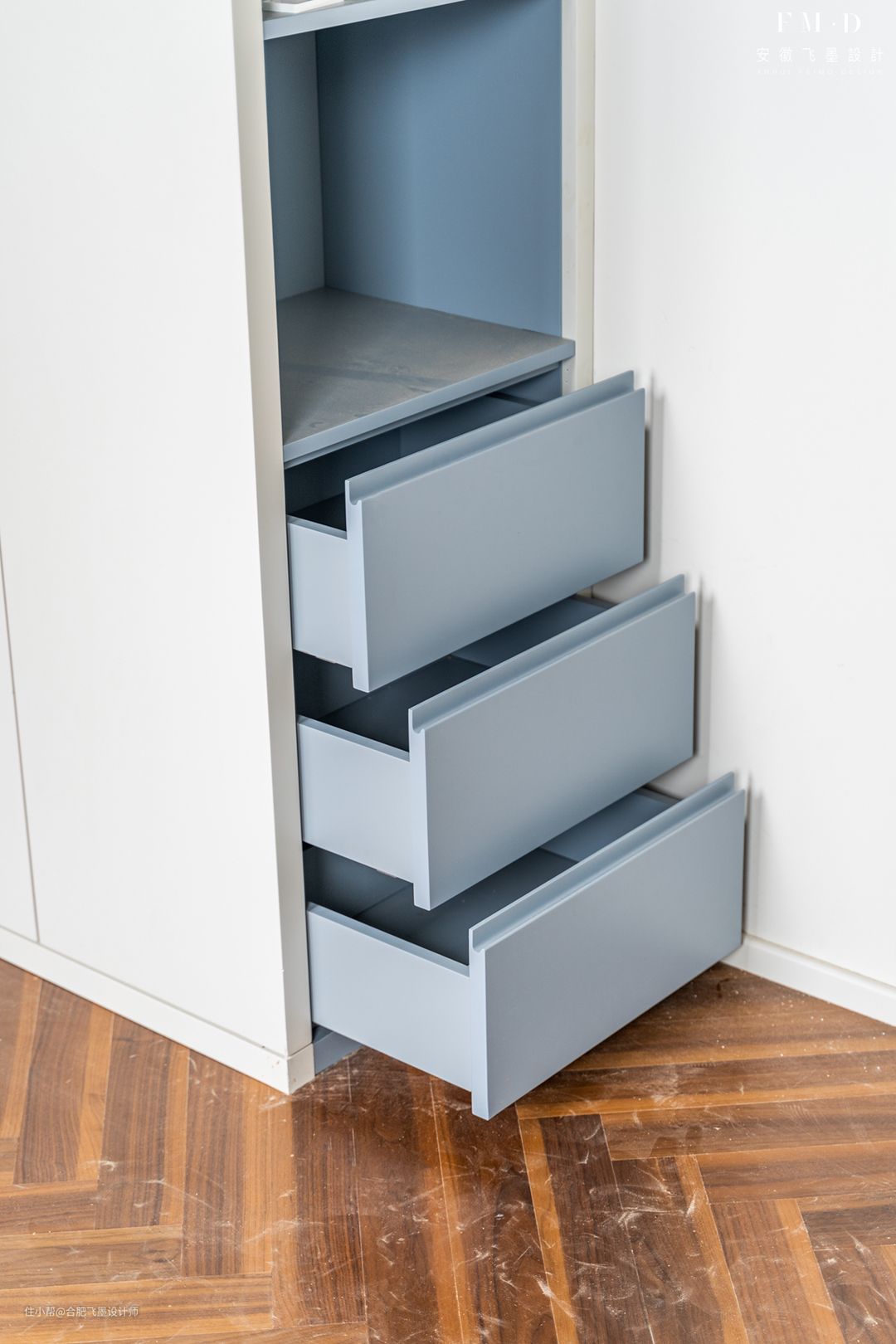 为了正面看上去更统一,最好跟衣柜选择同款的见光板。如果担心东西多显得过于杂乱,那就底部设计成抽屉,一拉一推也很方便,不管预留多少深度,衣柜做侧边柜都值得借鉴,尤其是小户型。