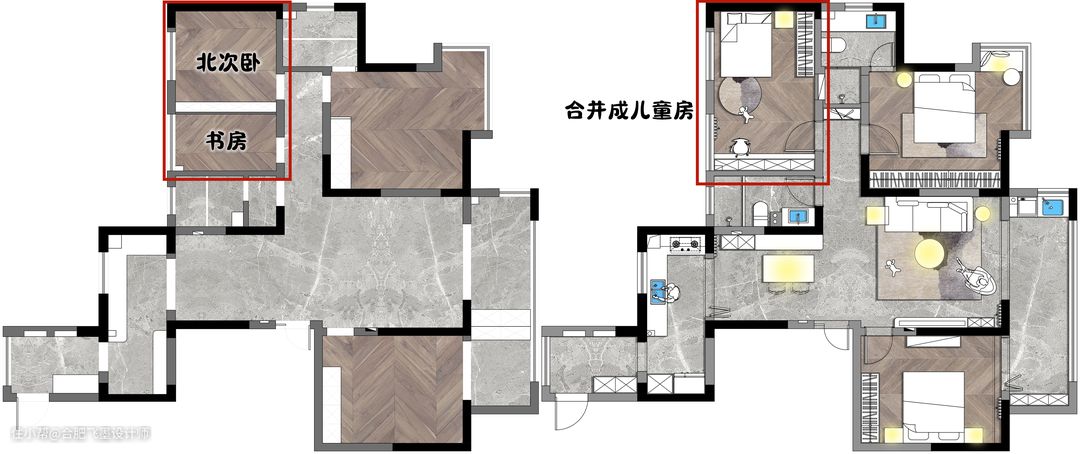 原本的北次卧和书房空间都很小,空间局促,索性直接打通改成儿童房,作为学习、娱乐兼休息一体式空间。家里三代同住,保留基本的3个房间就足够了,现在不是很流行“去客房化”嘛!