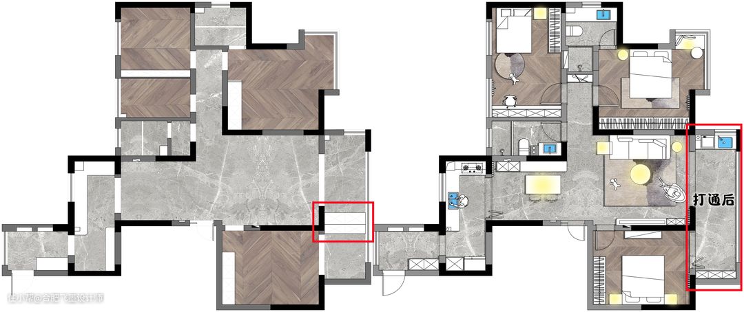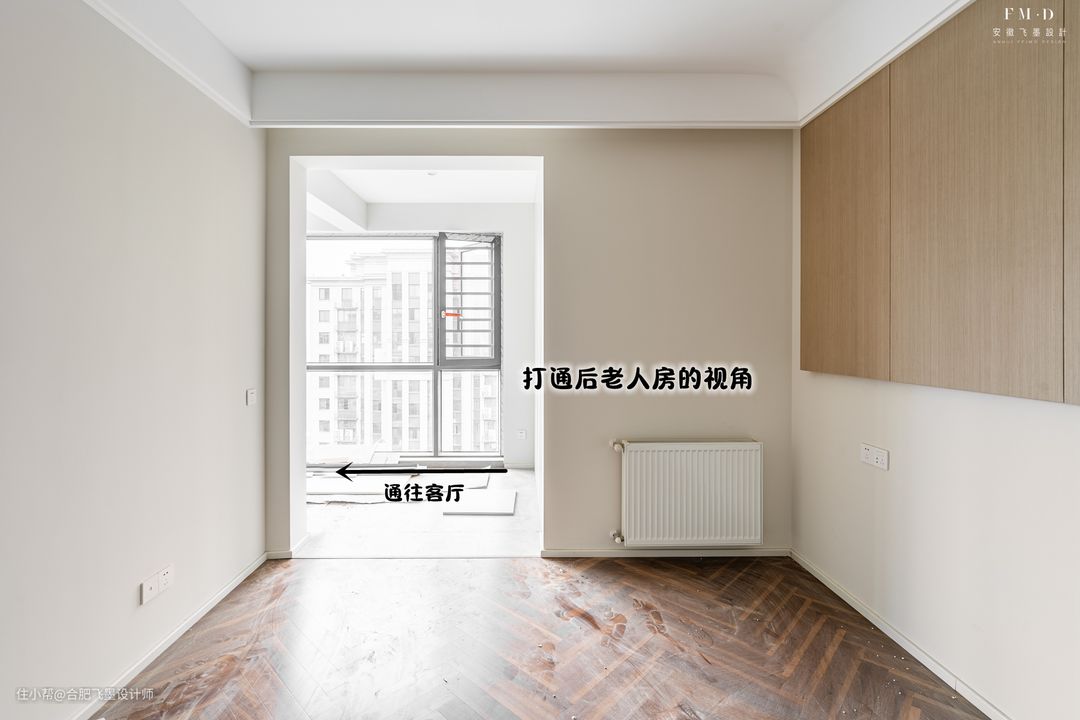 从户型图上就能看出,老人房和客厅原本是两个独立的阳台,打通后得到一个6米多长的大阳台,再拆掉客厅阳台门,一来视觉上更显大,采光好,二来客厅和老人房之间也形成洄游动线,活动更方便。