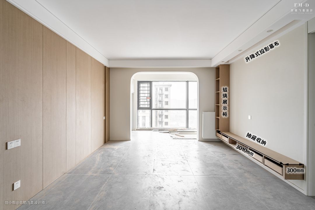 电视墙顶部隐藏投影幕布,闲暇之余也能感受大屏幕的视觉体验,不用时收起来不占地,后期如果想要安装电视也不影响。