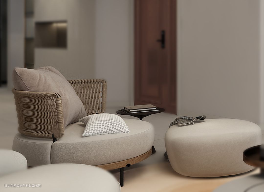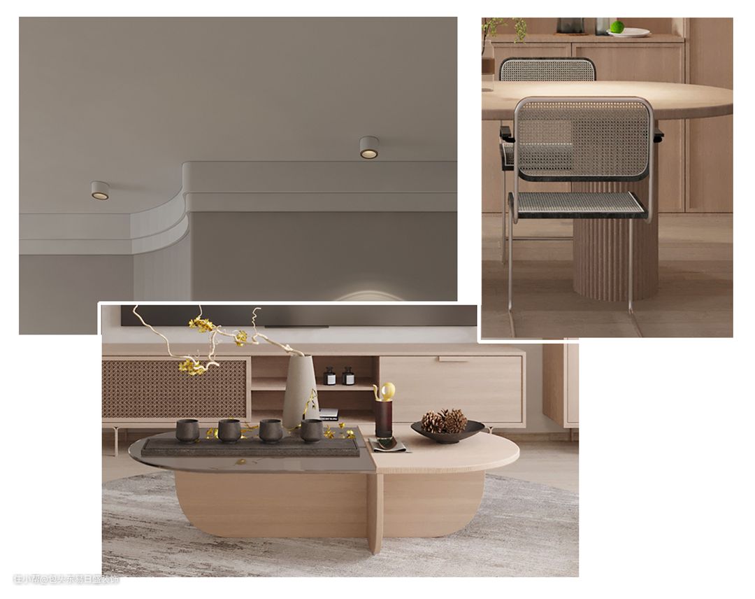 侘寂风强调质朴自然,不刻意突出事物的装饰和外表,奶油风强调软糯的色彩和圆润的弧形等,二者相结合之后,空间使用的元素为原木、藤编元素,以及天然石材、拥有肌理感且色调浅淡的墙面、纹理粗糙的地板,顶面或墙面、门洞圆弧或拱形造型等。