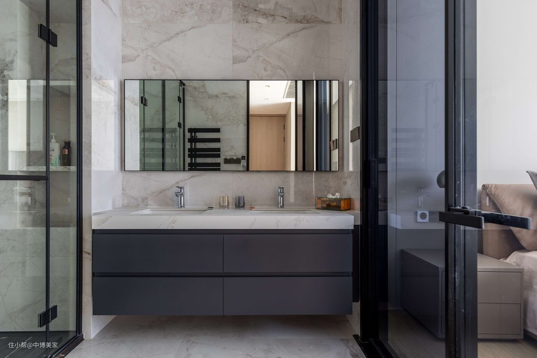 淋浴房则是以灰色调地砖打造,搭配玻璃推拉门的设计,干湿分离,让空间显得实用而稳重大气。