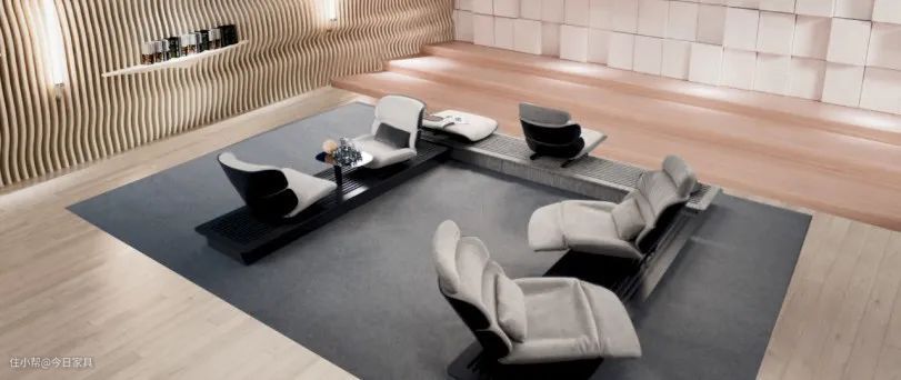 会客模式B:中间有方几的座位各向对方转45度;另外一侧的一对座位先前滑13cm,再各向对方转30度,主人位座位先前滑13cm,再朝旁边的座位转45度,打造更具私密性的会客场景,比较适合轻松氛围下的会客。