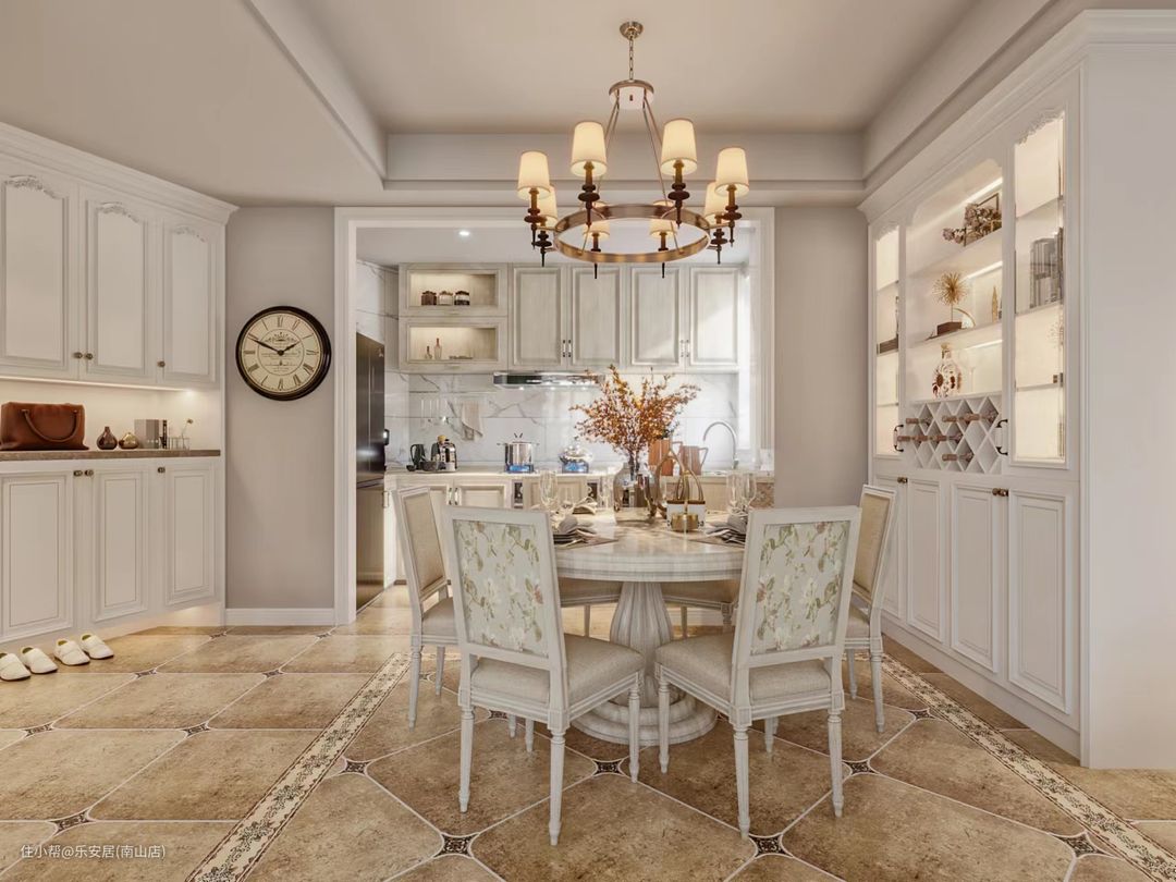 座椅采用白色为主的美式简约设计,与餐厅墙面的白色乳胶漆相呼应,再搭配天花板的复古金属吊灯与墙壁上的挂钟,整体给人一种19世纪美国人家在餐桌上其乐融融享受美食的感觉,氛围感拉满。