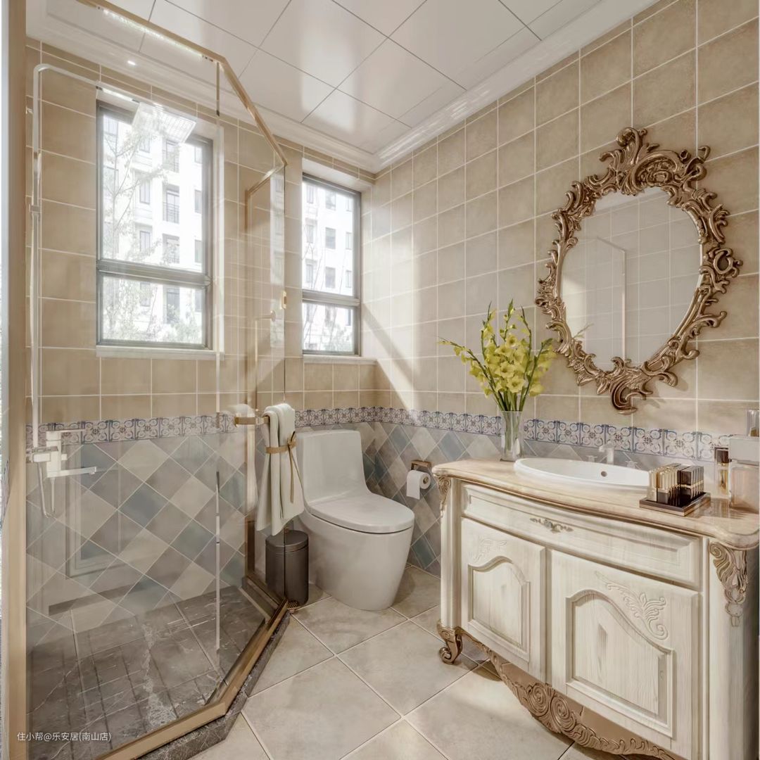 卫浴间全部用花式瓷砖铺贴,让空间看起来开阔明亮。靠边的柜子,方便收纳洗浴用品和洗手,省去了收纳的工具也有效的利用了空间。