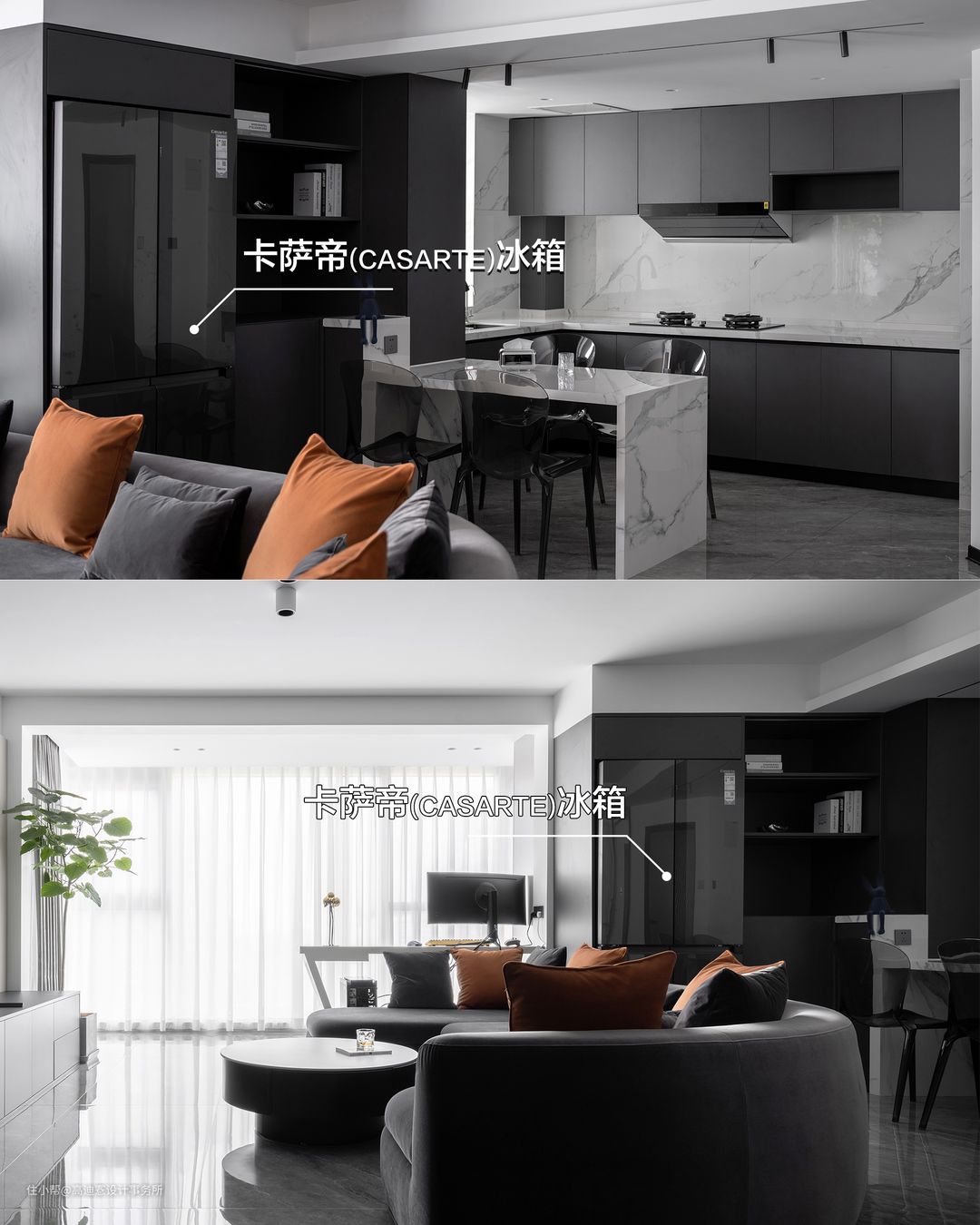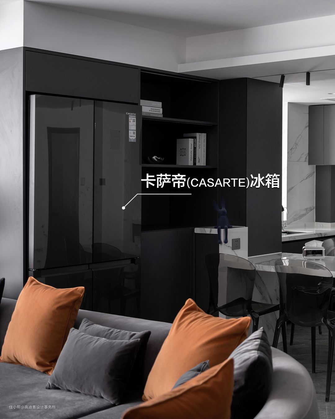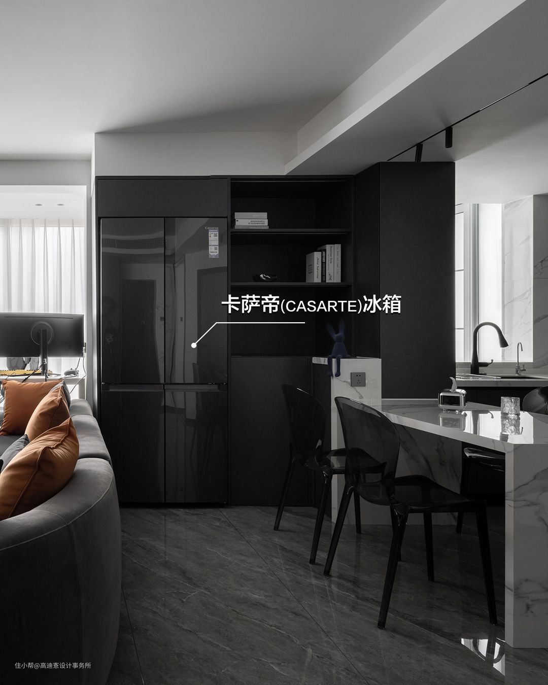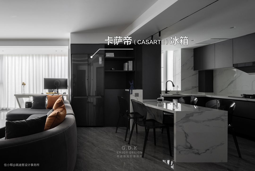 这是为一对年轻夫妻打造的第一居所,针对居住的年轻化、无访客化、以及去家务化等特征,我们在设计上采用了公区 ”去边界化“ 的设计理念,将厨房、餐厅、书房、洗衣房等都改为开放式结构。而这种大开大合的开放式空间,对于室内的所有家电家具的安置都十分严苛。