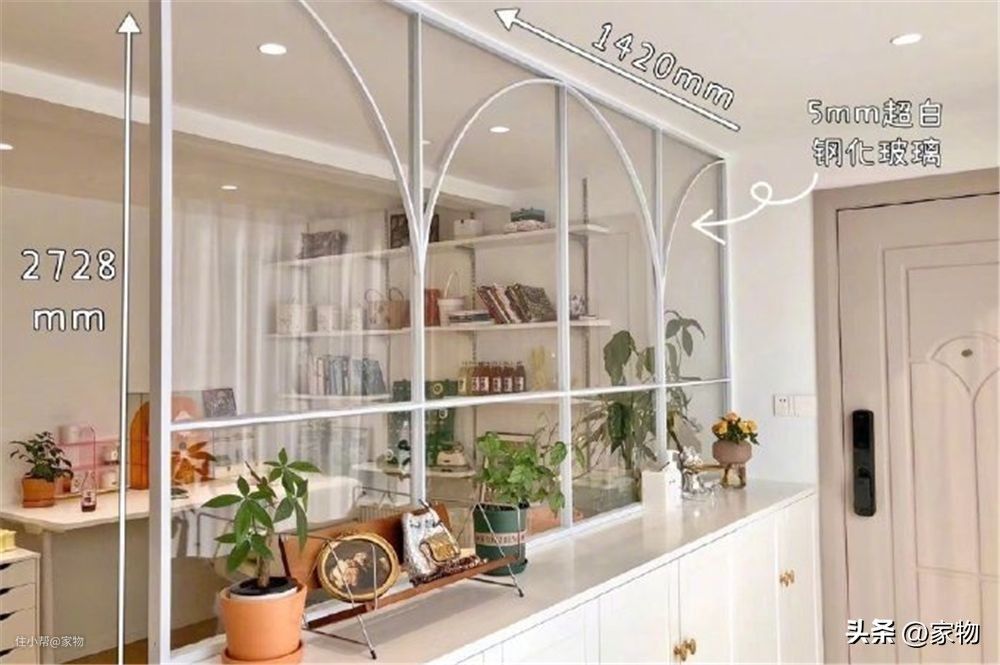 玄关与室内用玻璃进行隔断,正好利用起玄关柜子上方的区域,这样做一来不会影响玄关的通透感,二来也能巧妙分隔出室内外区域,让玄关保持空间独立性。