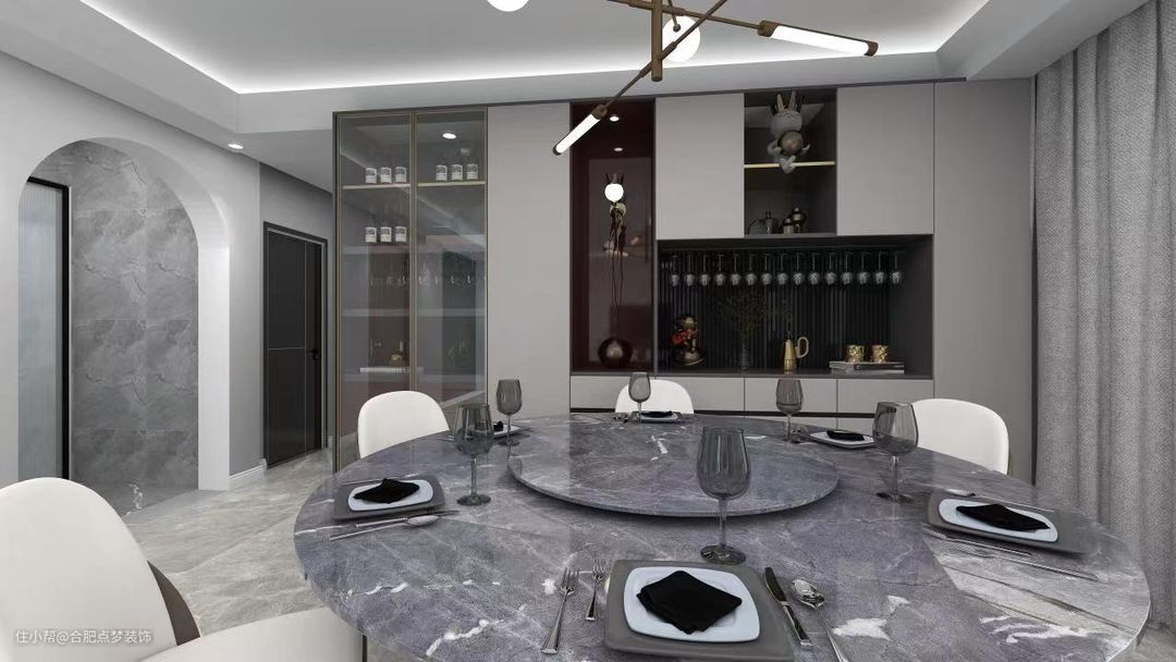 餐厅的话,可以把门做成拱形不会让整体那么的锐化、庄严。就餐桌可以选用大理石旋转圆形桌,也不怕家里来客人没地方坐。同样,桌子对面也用玻璃展柜和书房形成一个呼应,不违和。