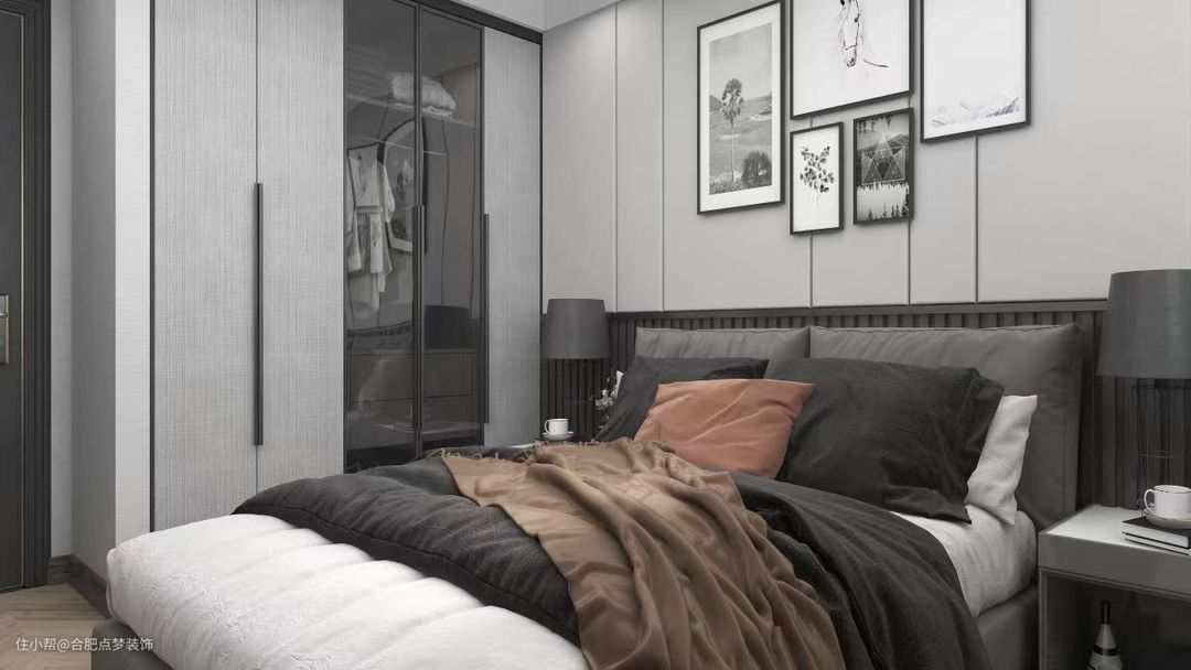 把卧室搭配成冷色调,,整体灰色为主,高级又好看。衣柜采用推拉门,空间显大还便捷。