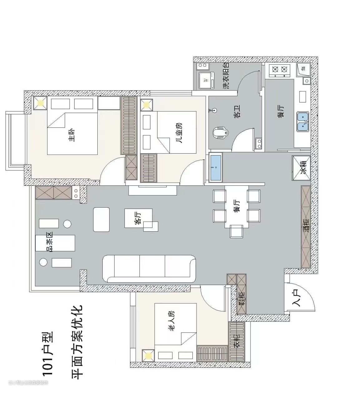 这是由张鹏设计师设计的春城时光花园101平的户型鉴赏