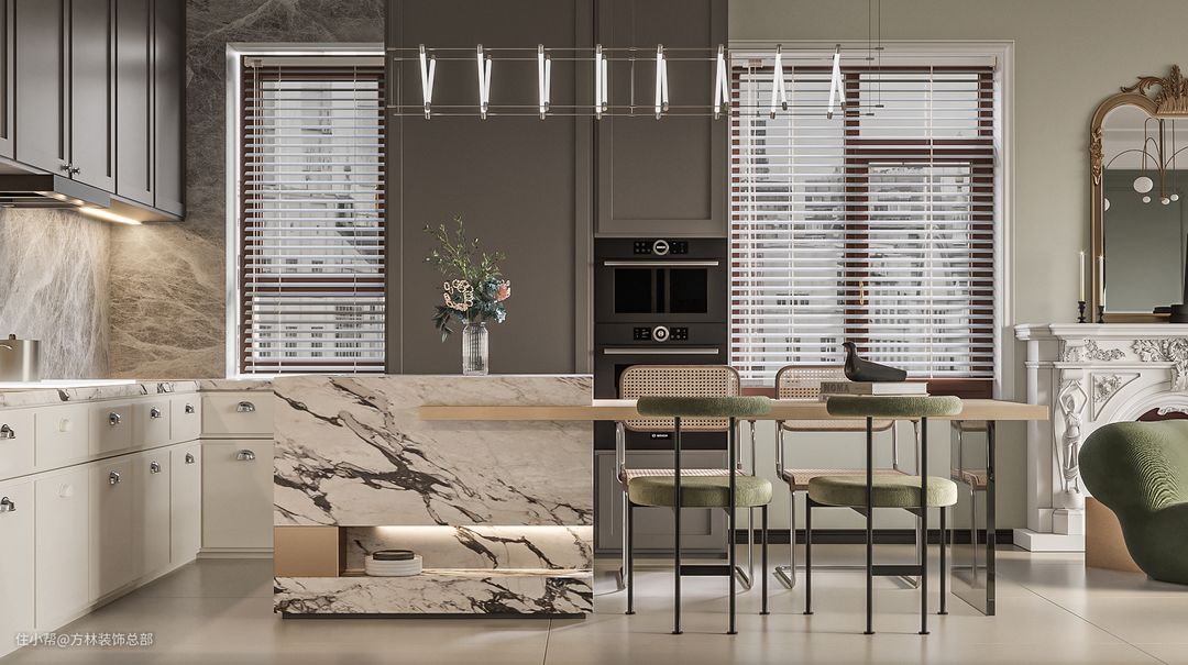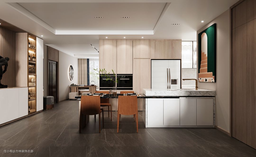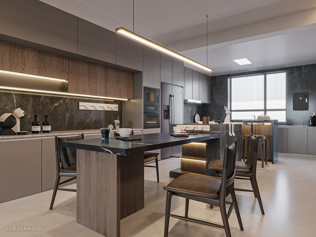 开放式厨房内餐桌和岛台常设计成一体化,岛台既可当作操作台面又能作为餐桌的延伸,这在一定程度上优化了厨房的动线,提高了烹饪和出餐的效率。