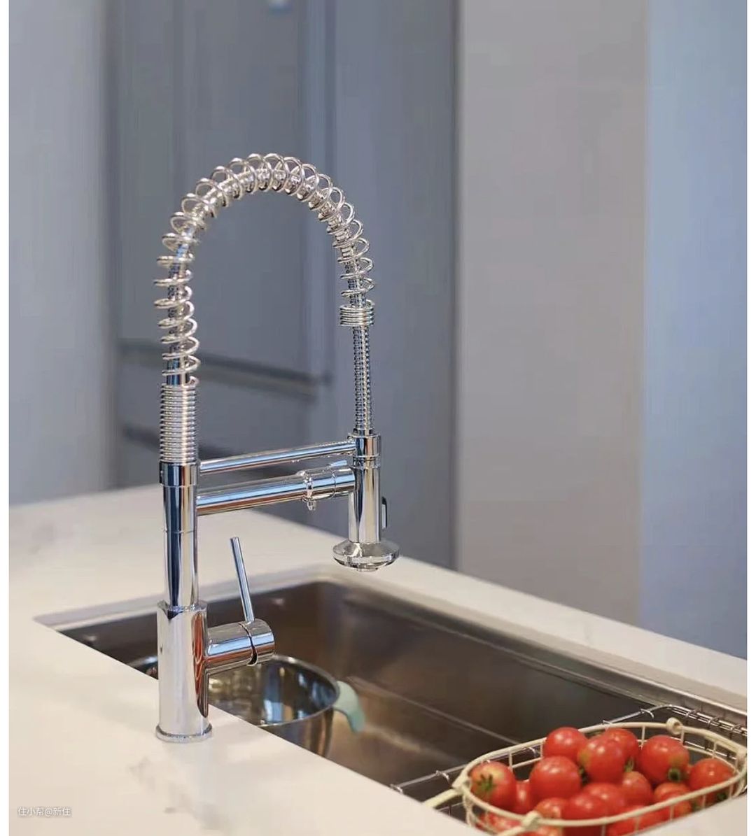 卫生间尽量选这种带升降的,开口高一点的抽拉水龙头,厨房则直接选择弯头,向下的水龙头。