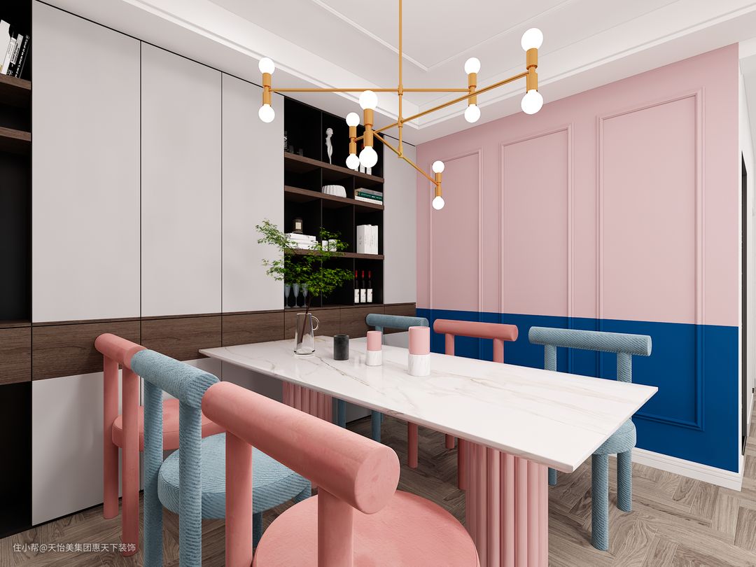 餐厅依旧是粉色为主搭配蓝色的处理,整个配色看起来会更加具有北欧的清爽感,在空间的搭配上也更加好看不会单一,墙面做了石膏框线的处理,也不会觉得过于单调。
