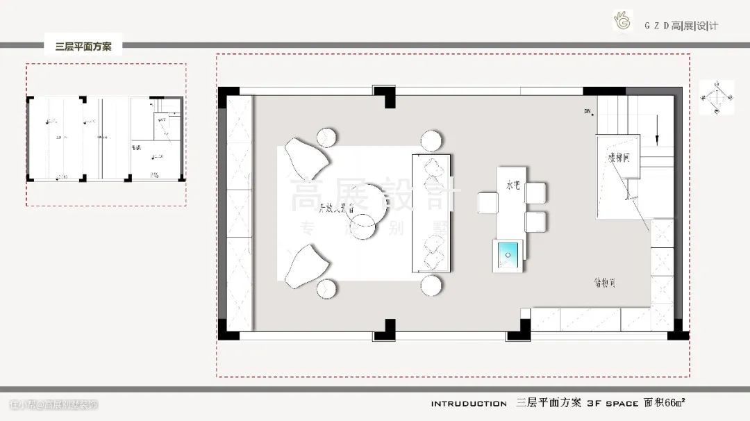 设计师将三层空间打通,形成一个开放式的空间,规划为影音区和水吧区,靠墙增加了一些收纳柜。这层主要作为娱乐空间来使用,一家人可以一起观影、品茶。