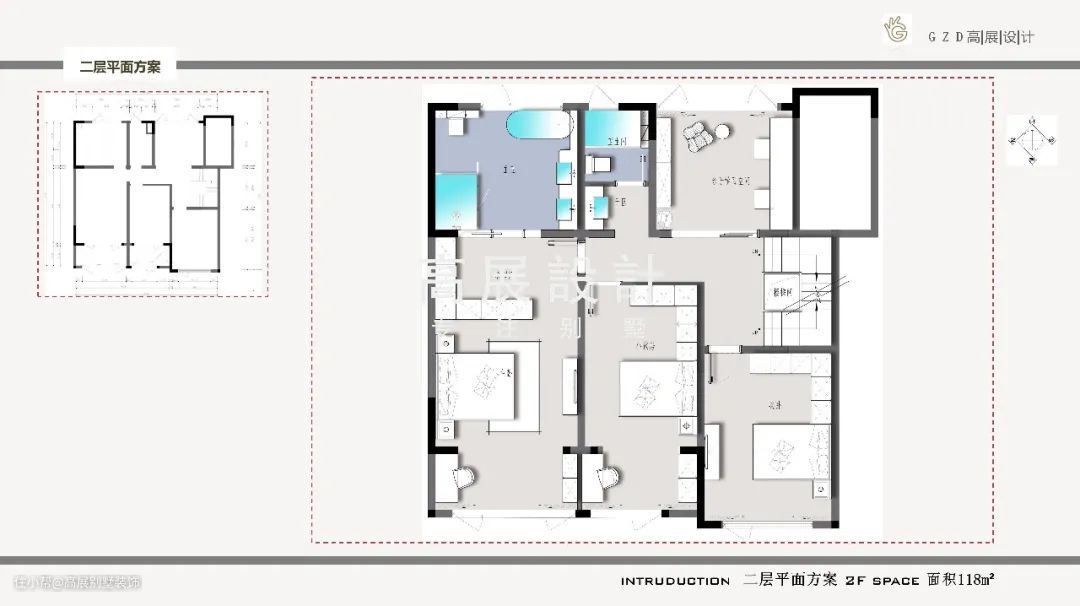 二层为居住空间,三间卧室并排均朝南,将阳台空间均打通纳入睡眠空间,采光和通风都非常好。其中主卧作套房设计,是一个内设独立衣帽间与双台盆明卫含浴缸的独立套房,因为主卧门正对楼梯口,所以设计师为了增加私密性,以L型衣帽间引入睡眠空间。