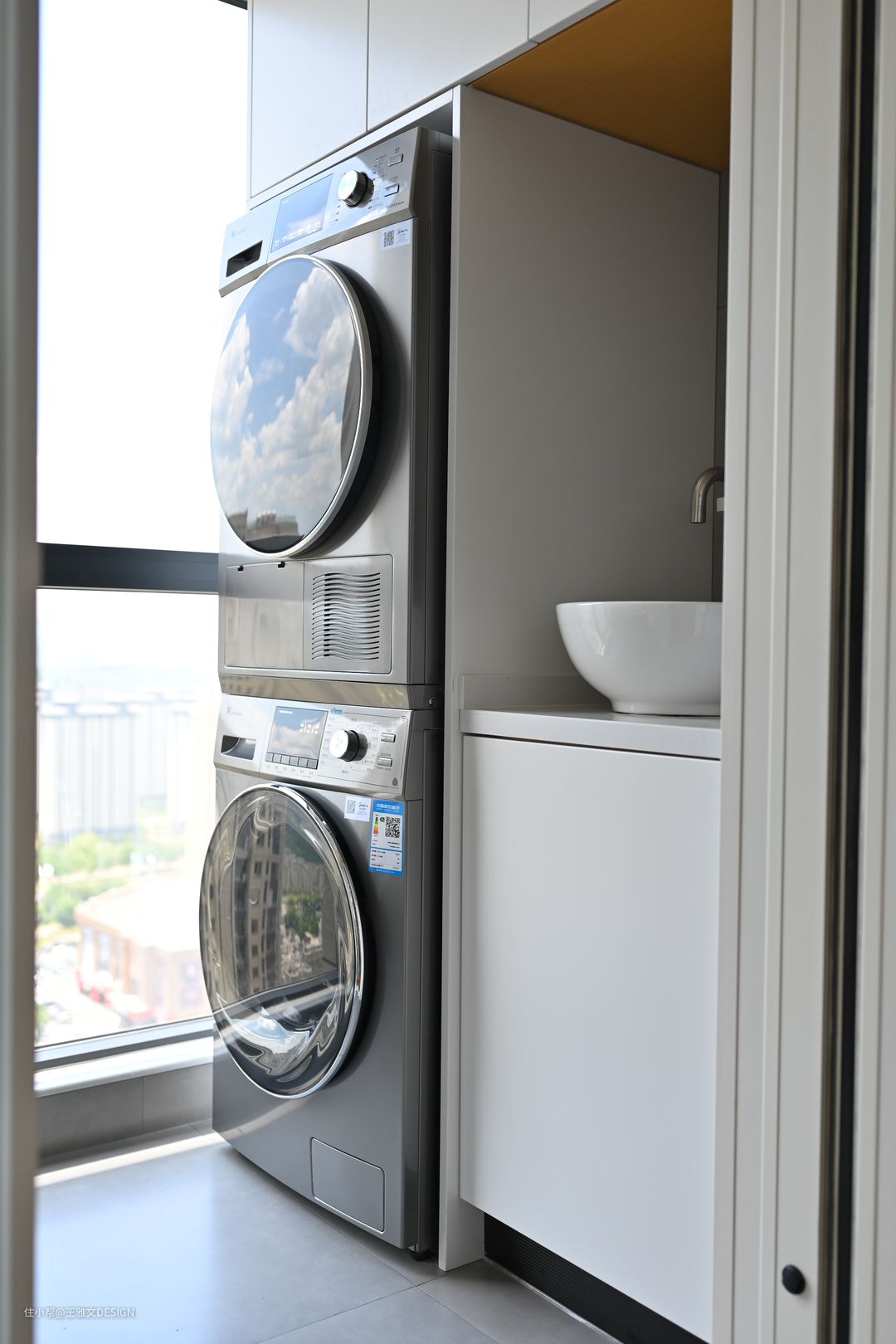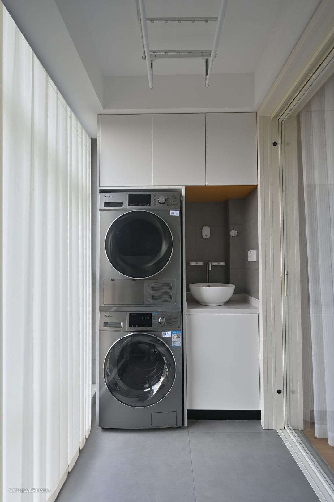 △卧室移门推开外面就是生活阳台,主要用于洗衣和晾晒。一组定制柜子将洗衣机烘干机、台盆融为一体,上面的吊柜还可以储物,十分规整。