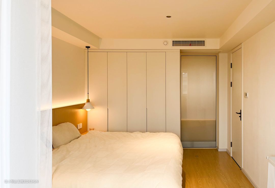 ❀原先的客厅是暗厅完全没有窗户,于是将主卧室的门改了朝向之后利用原先的门洞做了玻璃隔断,通过阳台将采光吸引过去。卧室也沿袭了整体的原木色系,温暖而放松。