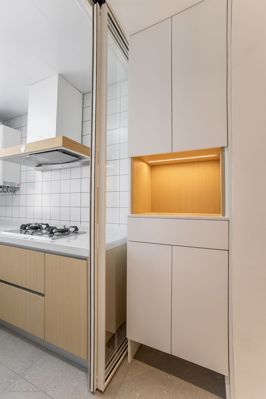 △入户口利用厨房跟侧墙的间隙做了鞋柜,厨房与鞋柜之间做了上吊轨的玻璃门这样一进家门视线非常通透,虽是封闭式厨房也具备开放厨房的效果,厨房也融入整个家的风格之中。