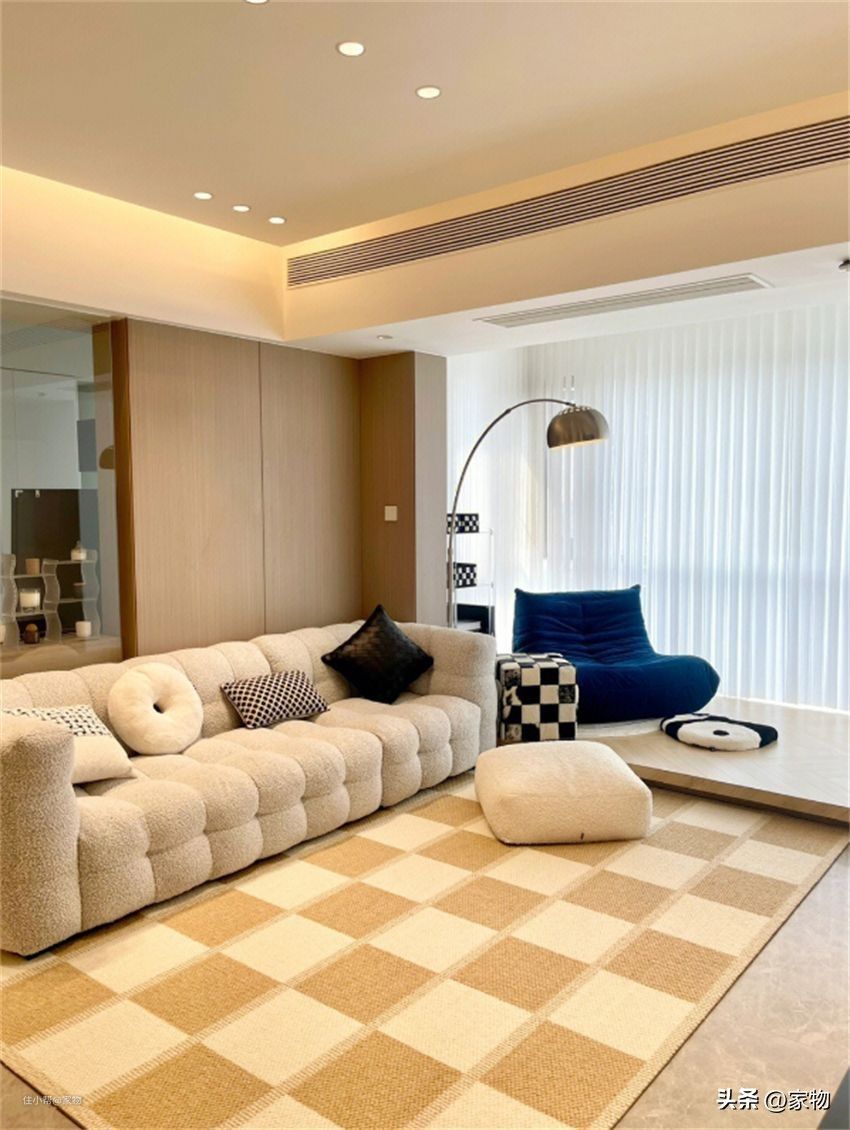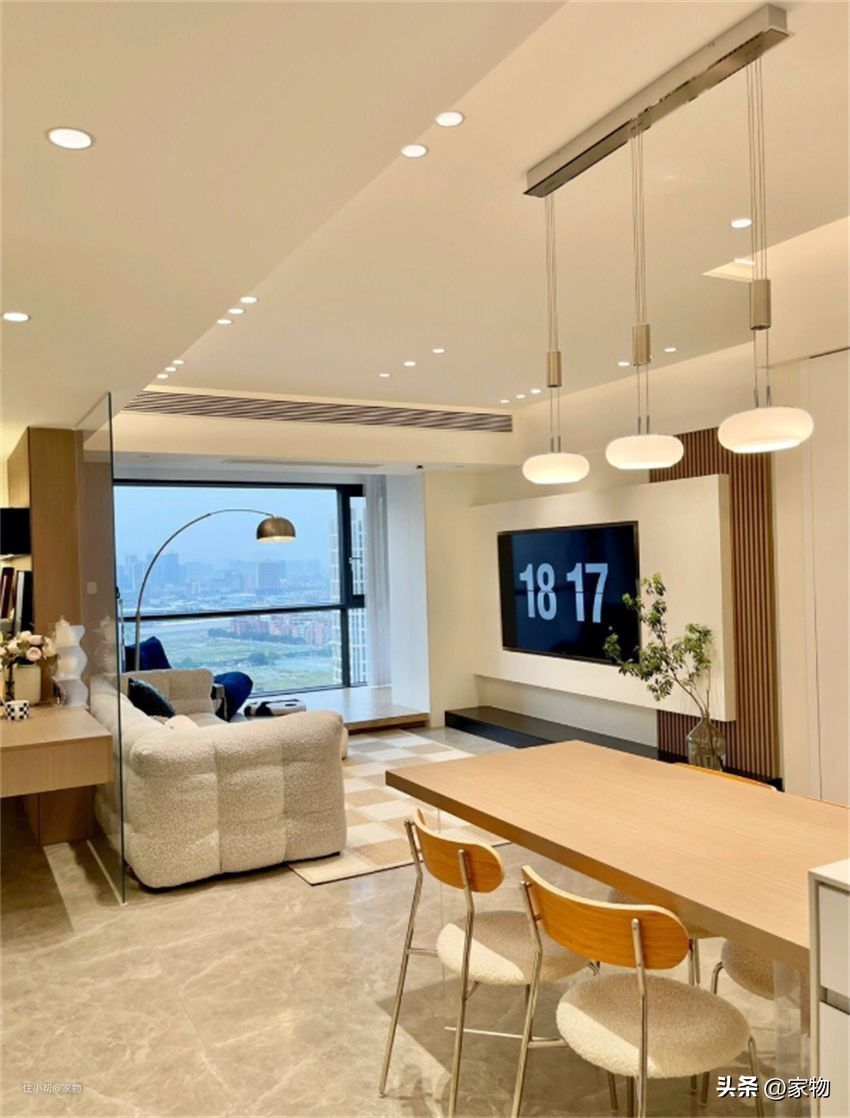 实体墙换成透明玻璃,视觉更轻盈,客厅和房间的边界感打通,空间被放大,远远望去客厅敞亮开阔,心情都舒畅。