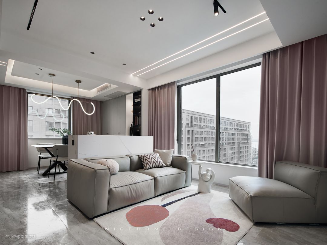 其次,如果家里是轻奢风,比如地面是柔光或者亮光的瓷砖,墙面有石材、镜面或者金属等材料的光泽度较高,可以选择有光泽度的窗帘,比如绒布或者有光泽的雪尼尔等;也要注意有的绒布或者雪尼尔也有缩水的问题。